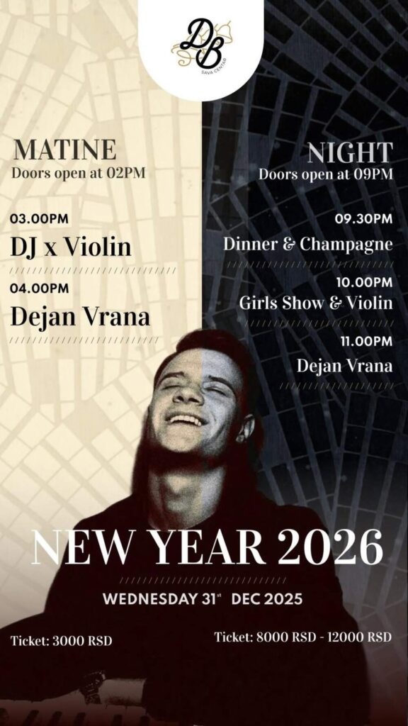 Cene karata za doček Nove godine 2026. kreću se od 8000 RSD do 12000 RSD (€), a uključuju svečanu novogodišnju večeru koja će zadovoljiti i najizbirljivije gurmane. Piće je dostupno po utrošku, uz piće dobrodošlice koje će dodatno podići raspoloženje.