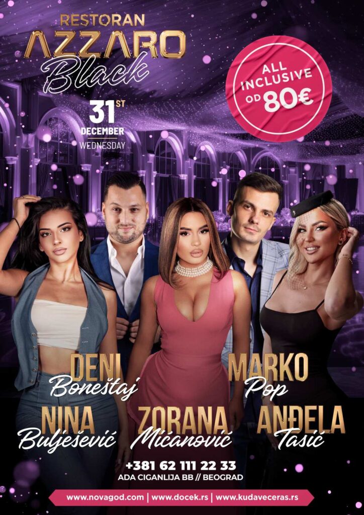 Doček Nove godine 2026. u restoranu Azzaro Black pruža vam priliku da uživate u luksuznom ambijentu i vrhunskim uslugama. Ovaj restoran nudi svečanu večeru u obliku set menija, dok vas zabavljaju talentovani izvođači poput Zorane Mićanović, Denija Boneštaja, Anđele Tasić, Marka Popa i Nine Bulješević.