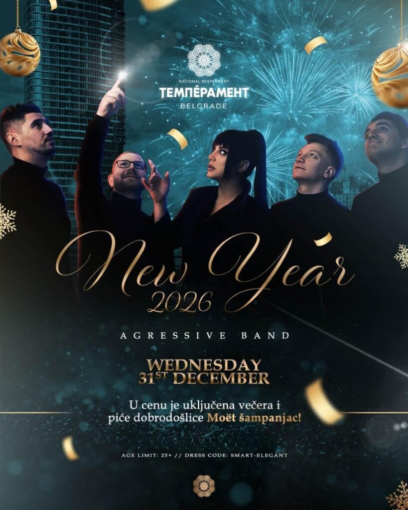 Doček Nove godine 2026. u restoranu Temperament je savršena prilika da uživate u luksuzu i eleganciji. Ovaj restoran nudi svečanu večeru po ceni od 110€, uz piće po utrošku i jedno piće dobrodošlice. Uživajte u vrhunskoj usluzi i specijalitetima koje je pripremio naš šef kuhinje, dok se opuštate uz zvuke Agressive banda.